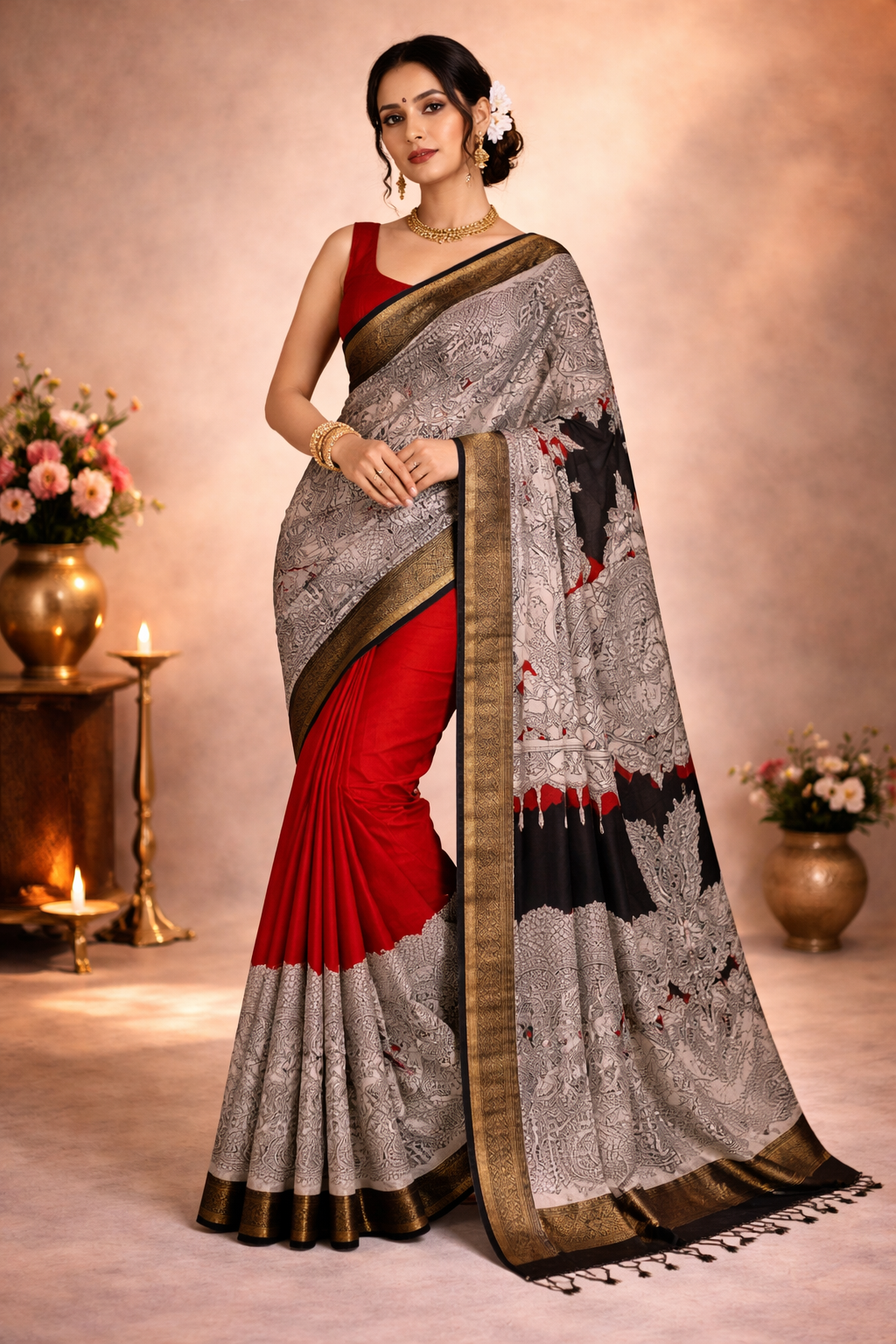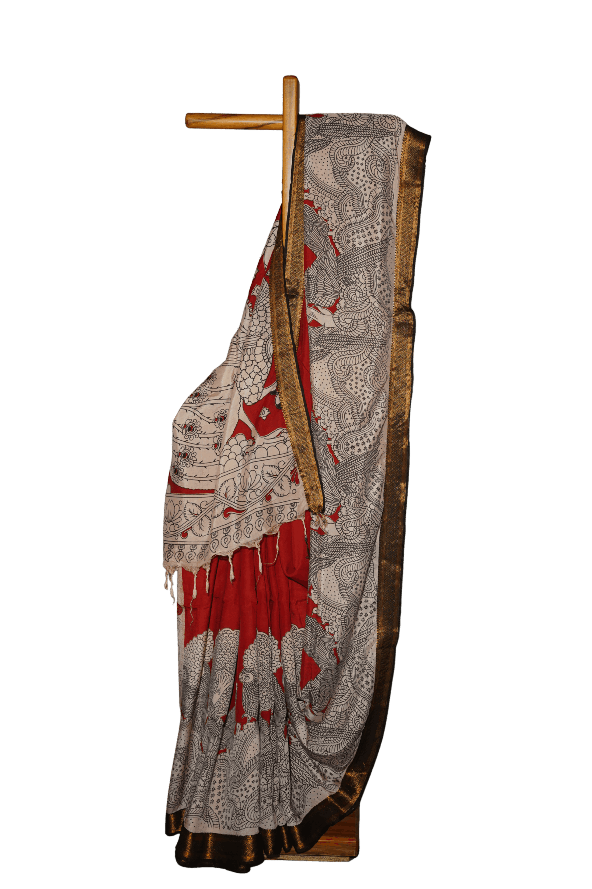 - Colour: Red With White & Black Kalamkari Print & Nizam Boarder